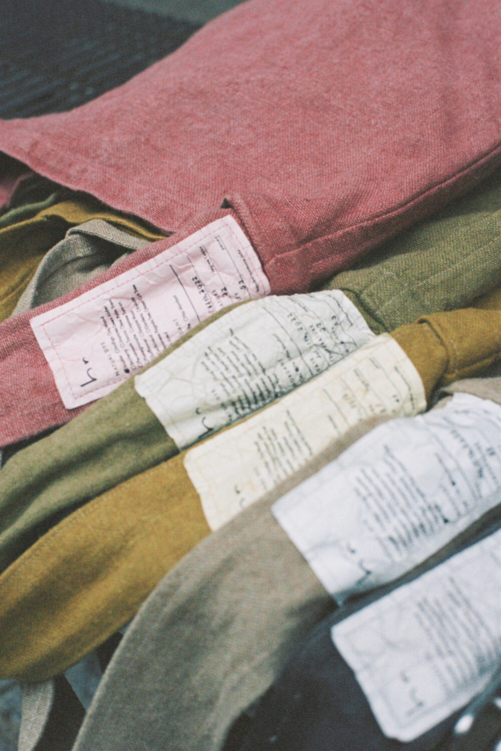 植物で染めた布は、経年変化の様子もレイヤーです。柿渋染めは、硬い柿渋の皮膜がだんだんと剥がれていくような風合いの変化があります。使い込まれて色褪せた布からは、媒染の金属の色がそっと顔を覗かせます。