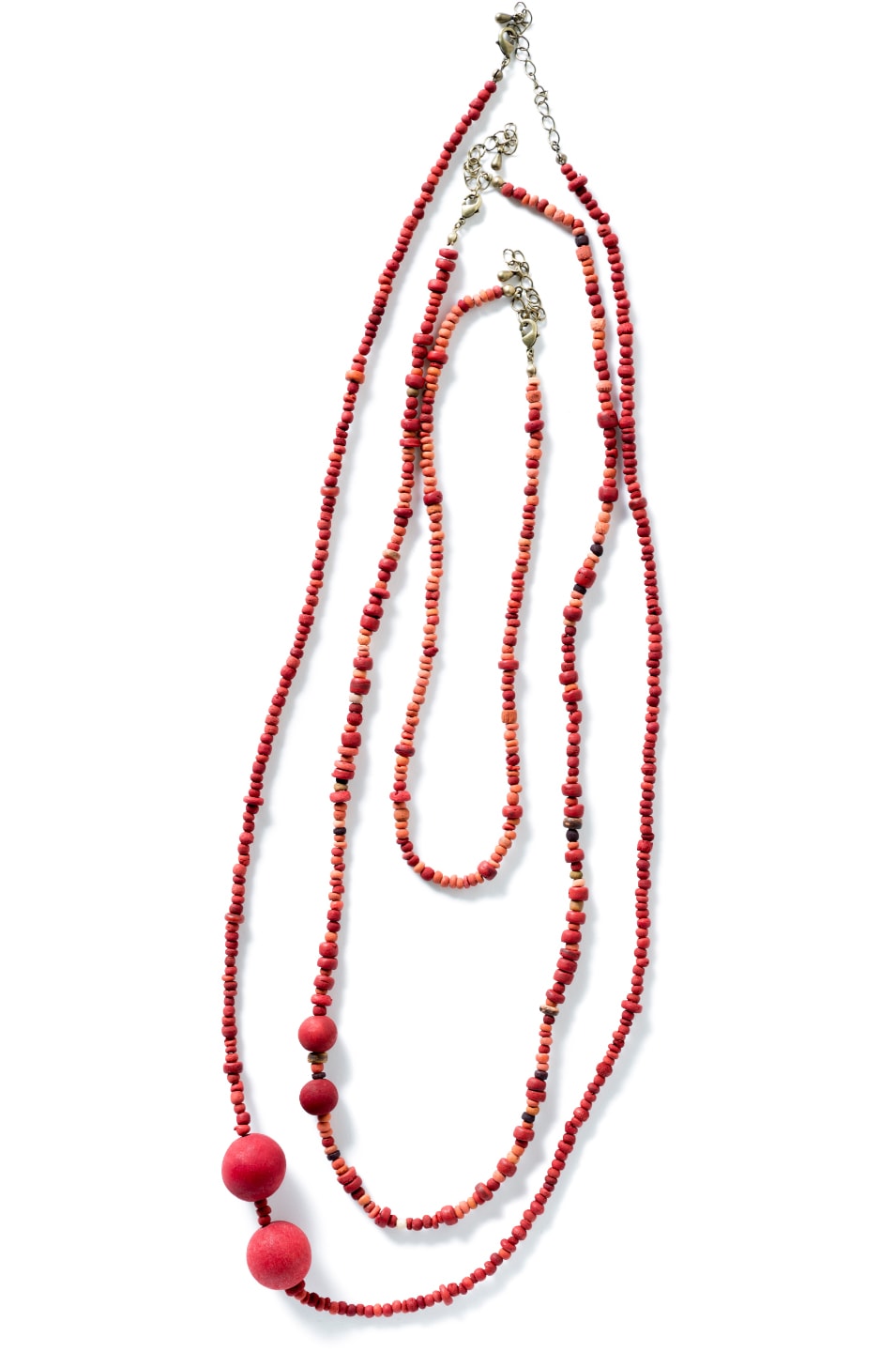 草木染めで染め上げた、ウッドビーズのアクセサリー。不揃いなビーズ一粒一粒を、全て手作業で繋ぎ合せています。植物を煮出す時間や染め置く時間、分量によってビーズの色を調節しています。「茜」「藍」それぞれベースの色に、ザクロで染めた黄色が入っていたり、紫色が入っていたりと、どんな色のビーズがアクセントとして入るかはお楽しみ。染め上げたビーズを天然の蜜蝋でコーティングし、まるで木ビーズがキラキラと輝いているような、艶感を出しました。木の素材なので、非常に軽いのも特徴。雨の日は湿気で色が濃く見えたり、使うほどに艶が増したり、肌の上で育っていくようなアクセサリーです。