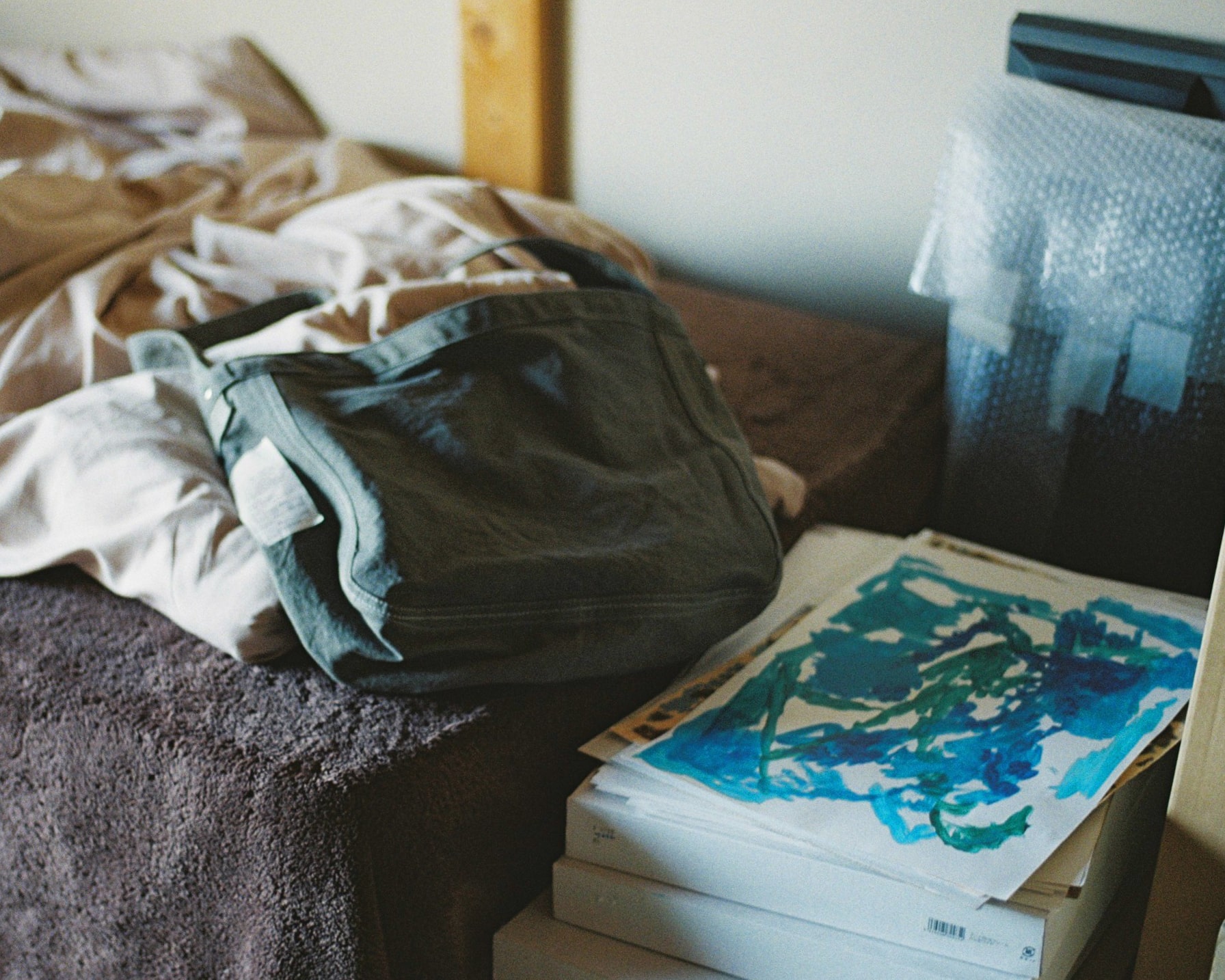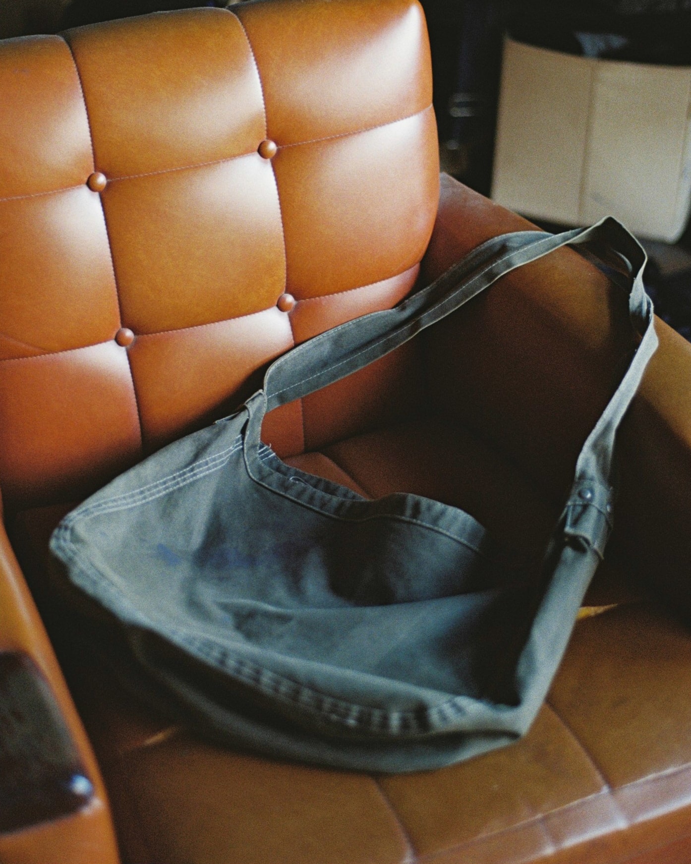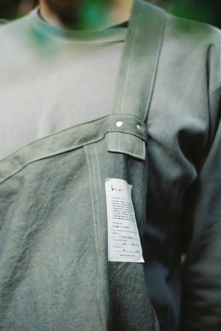 「Essay」をテーマに、人との対話を通してかばんのカタチを探るシリーズ。〈Record Bag〉は、画家の神馬啓佑さんが20年間愛用していたかばんをモデルに生まれました。神馬さんが、意図せずにかばんの裏表逆に使っていたエピソードをヒントに、あえてかばんの裏側を見せるデザインにしました。身体により馴染むようにショルダー部分を愛用品より短めに設計し、側面にはスマートフォンが入るポケットを足すなど、機能的にも使いやすく改良しました。haru nomuraのブランド初期を思い出させるような、植物の色を最大限に引き出した色展開も特徴です。「極限まで鮮やかに染めることで、草木の経年変化の色を永く楽しめるように」という思いがあります。